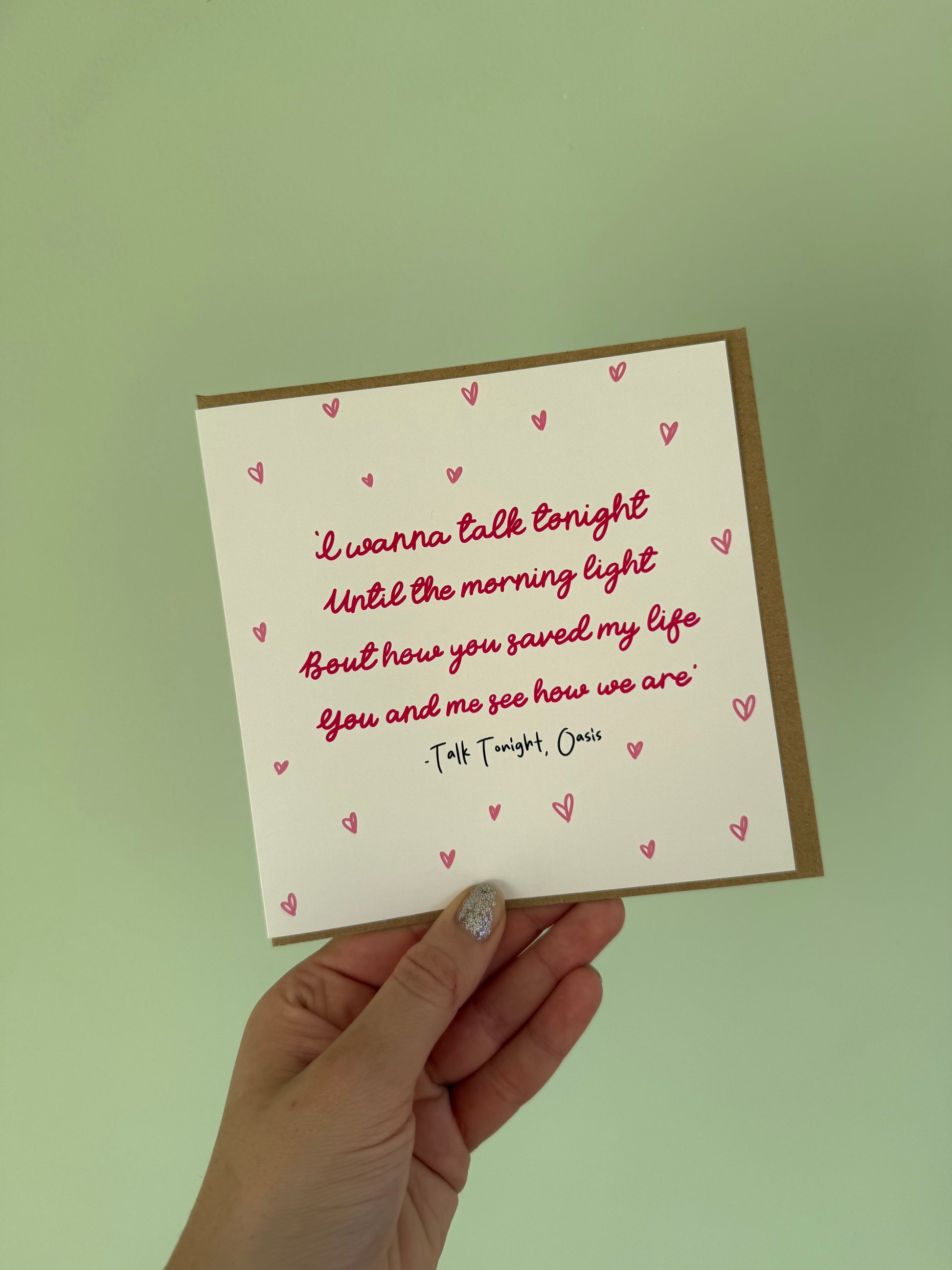 Square card featuring lyrics from the Oasis song “Talk Tonight” with pink hearts. The perfect Valentine’s Day card to send to an Oasis fan. This card could also double as a mini print!