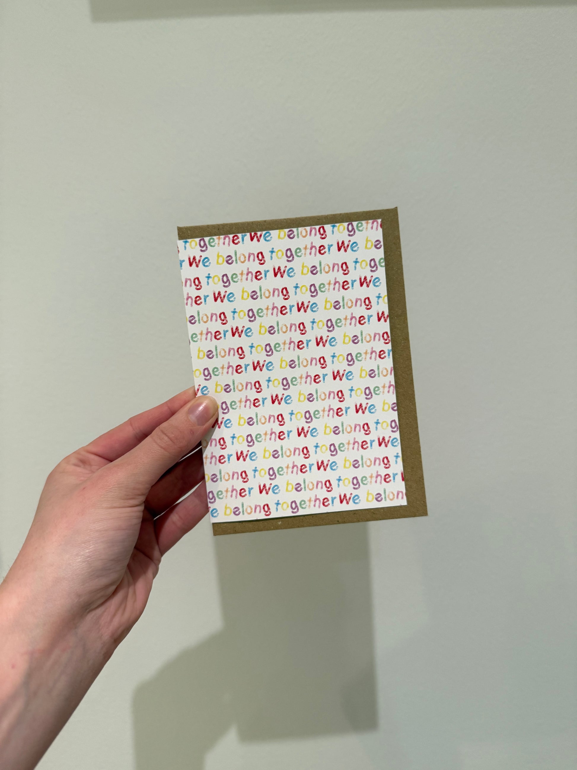 Card features "we belong together” continually written along the card in multi coloured writing. The perfect card for anniversaries or just to send to someone you love.